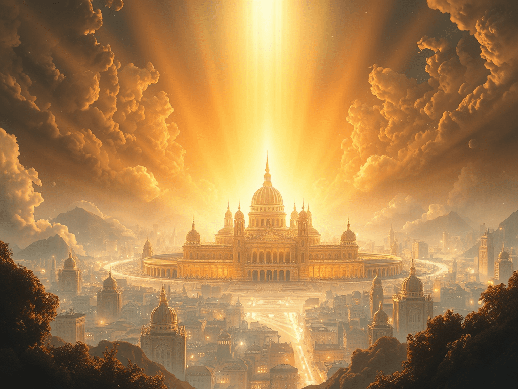 a city, radiant with light, descending from above.